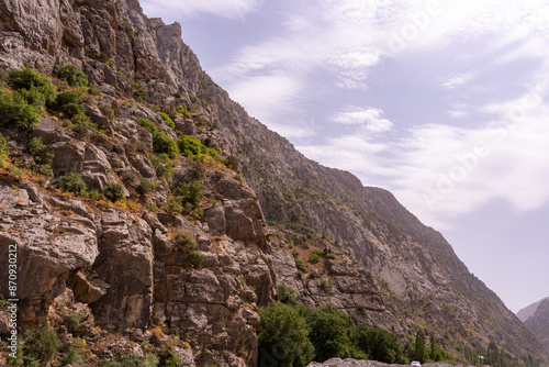 © oybekostanov, Fototapeta premium A mountain range with a cloudy sky in the background