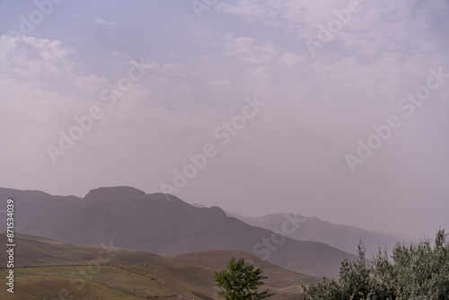 © oybekostanov, Obraz premium A mountain range with a cloudy sky in the background