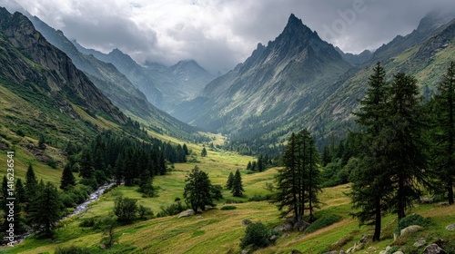 © Natalia, Obraz premium a mountain range with a green valley in between,stock image