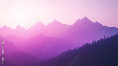 © Albert, Fototapeta premium A mountain range with trees in the foreground and a pink-purple sky backdrop, sun included in the distance