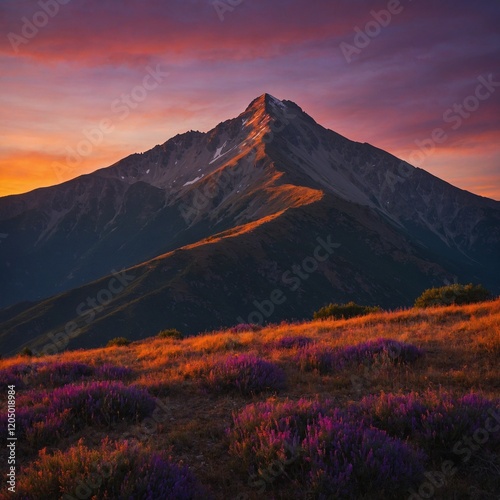 © Asad, Obraz premium "A mountain ridge silhouetted against a vibrant orange and purple sunset."