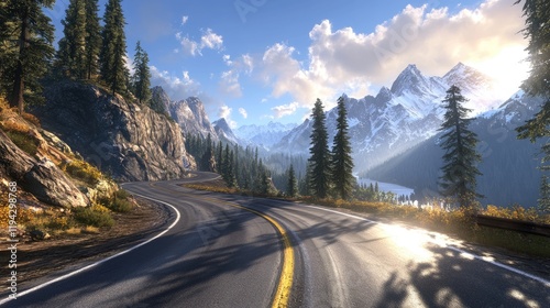 Fototapeta premium A mountain road bordered by pine trees, with sunlight streaming onto the...