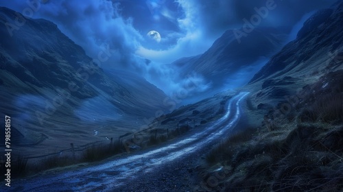 © Plaifah, Fototapeta premium A mountain road illuminated by the soft glow of moonlight, casting shadows and creating an enchanting nocturnal scene in the highlands.