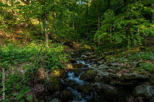 © Lukas, Obraz premium A mountain stream flowing through a landscape in a dense forest captured by long exposure time.