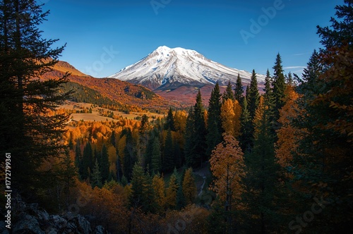 Fototapeta premium A mountain summit covered in snow surrounded by vibrant autumn foliage,...