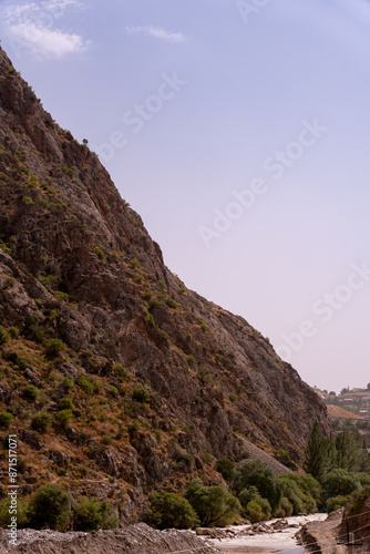 © oybekostanov, Fototapeta premium A mountain with a rocky cliff and a river running through it