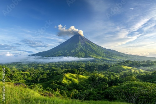Fototapeta premium A mountain with a volcano on top and a lush green forest below