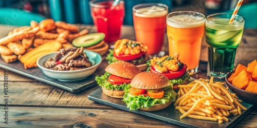 © hobonski, Naklejka premium A mouth-watering cheeseburger with a juicy beef patty, melted cheese, fresh lettuce, and ripe tomatoes served on a wooden cutting board alongside a generous portion of crispy golden french fries.