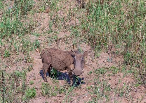 Fototapeta premium A mud-caked common warthog seen from above in the outdoors image with copy...