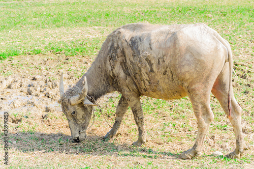 Fototapeta premium A muddy buffalo in a rural grass field, Chiang Mai Thailand