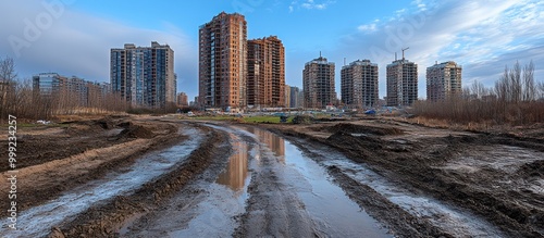 Fototapeta premium A muddy path leads towards a row of modern apartment buildings under a partly...