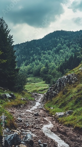 © Kelima, Obraz premium A muddy path winds through a lush green valley nestled in a mountainous landscape under a cloudy sky