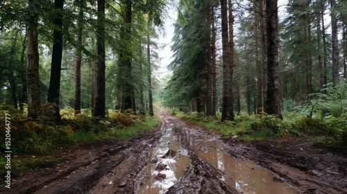 Fototapeta premium A muddy road through a dense forest.