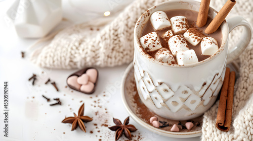 © Naeem, Fototapeta premium A mug of hot chocolate with marshmallows and cinnamon sticks on a white surface with star anise