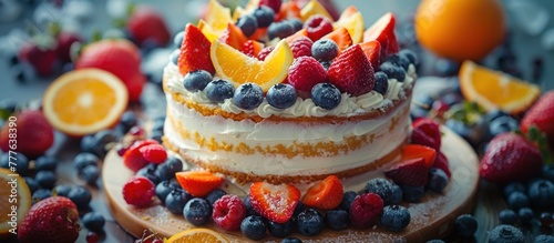 Obraz premium A multi-layer cake adorned with colorful and fresh fruits on top, creating a visually appealing dessert centerpiece.