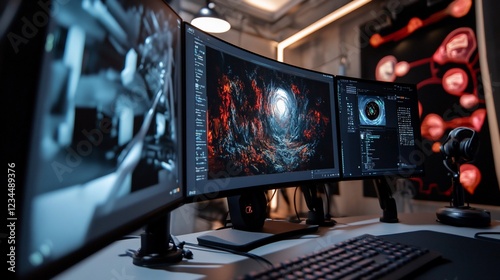 © @adha, Fototapeta premium A multi-monitor setup with a curved central display showing a fiery cave, alongside peripheral screens and equipment