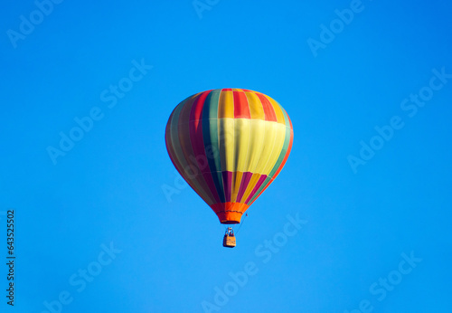 © sebi_2569, Naklejka premium A multicolored hot air balloon on a blue sky background