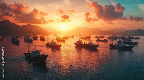 © Andi, Fototapeta premium A multitude of fishing vessels at sunset over water.
