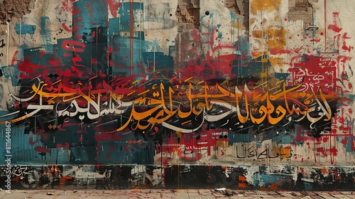 © Nawarit, Fototapeta premium A mural of calligraphy where vandalism has added spray paint over parts of the script, merging art and corruption