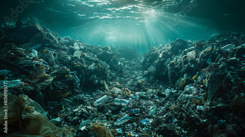 Fototapeta premium A murky ocean with plastic debris floating in it