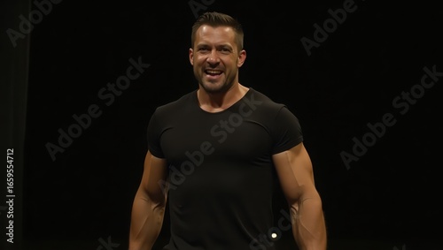 Fototapeta premium A muscular man in a black t-shirt, displaying a confident and enthusiastic expression, stands against a stark black backdrop.