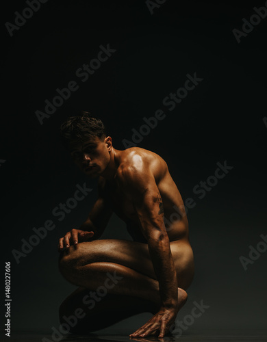 Fototapeta premium A muscular man kneels in a dynamic pose, captured under low-light dramatic...