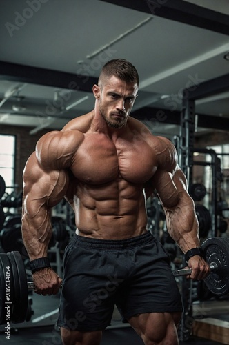Fototapeta premium A muscular man lifting weights in a modern gym focused on strength training...