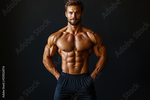 © darion, Naklejka premium A muscular man posing confidently against a dark background.