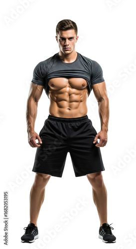 © YUSUF, Fototapeta premium A muscular man showcasing his toned physique, isolated on a transparent background, perfect for fitness and health-related projects, demonstrating strength and athleticism