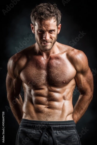 Fototapeta premium A muscular man stands in a strong pose, showcasing his well-defined body. The dramatic lighting highlights his physique against a dark backdrop, suggesting strength and confidence