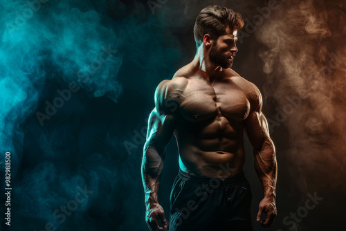 © mila103, Obraz premium A muscular man stands in front of a blurry background with smoke
