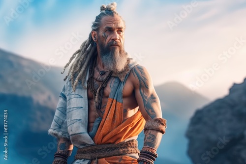 © ЮРИЙ ПОЗДНИКОВ, Naklejka premium A muscular man with tattoos wanders the mountains. Generative Artificial Intelligence