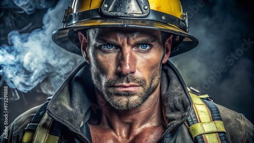 Fototapeta premium A muscular, smoldering handsome fireman in full gear, sweat-drenched and soot-stained, gazes intensely with piercing blue eyes, exuding rugged charm and raw masculine appeal.