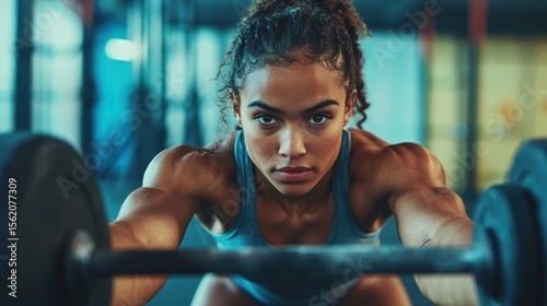 © Soem, Obraz premium A muscular woman in a gym, lifting a barbell with a focused expression.