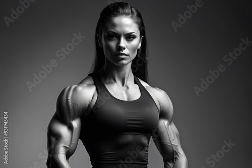 © StasySin, Naklejka premium A muscular woman poses confidently showing off her well-defined physique