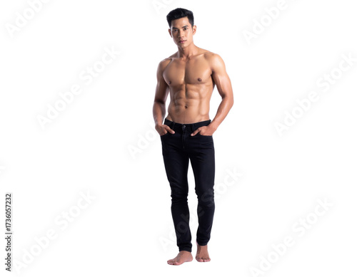 Naklejka premium A muscular young man stands confidently in casual attire, showcasing a fit...