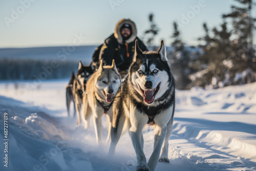 Naklejka premium A musher harnessing a sled dog in a winter landscape