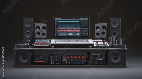 Fototapeta premium A Music Production Studio Setup with a Computer, Audio Interface, and Speakers