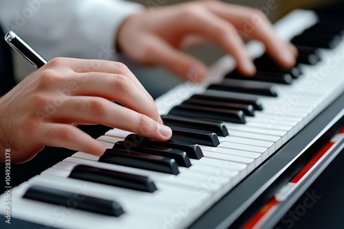 © Thanyarat, Fototapeta premium A music student taking notes during a piano lesson, scribbling down tips while the teacher demonstrates a technique
