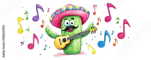 © Wimon, Obraz premium A musical cactus performing a serenade, complete with a sombrero and mustache, surrounded by music notes.