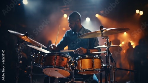 © Phoophinyo, Fototapeta premium A musician holding a drum stick is playing a song. Music program. Concert stage background.