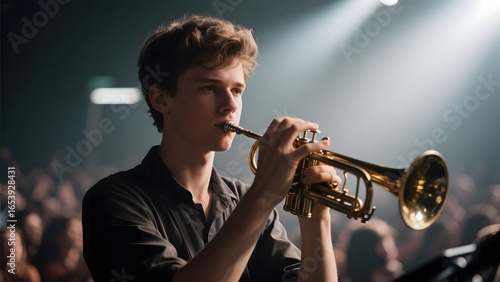 Obraz premium A musician passionately playing a trumpet on stage under bright lights.