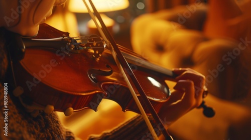 Fototapeta premium A musician plays a violin in warm, cozy lighting, showcasing skill and passion in a peaceful setting at home.