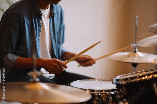 Naklejka premium A musician plays the drums, showcasing skill and passion in a warm, inviting setting.