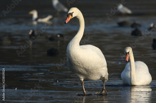 Fototapeta premium A Mute Swan (Cygnus olor) walking on a frozen lake.