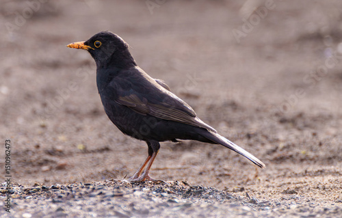 Obraz premium A Mysterious Black Bird is foraging diligently and gracefully on the Grounds surface Turdus merula