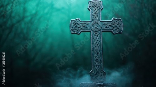 Naklejka premium A mysterious cross emerges from a misty, dark background, evoking themes of...