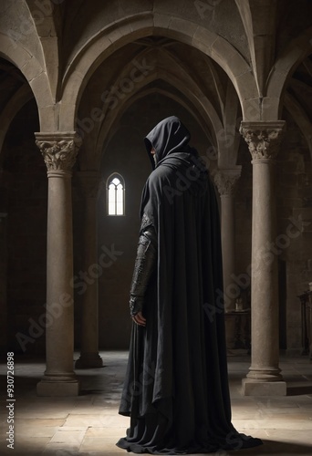 Naklejka premium A mysterious figure in a dark cloak stands in a medieval setting, shrouded in...