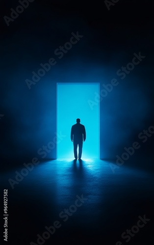 Fototapeta premium A mysterious figure stands in a doorway, bathed in blue light, evoking a...