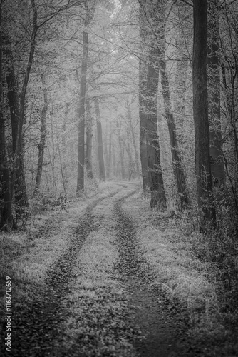 Fototapeta premium A Mysterious Foggy Forest Pathway, captured beautifully in striking Black and...